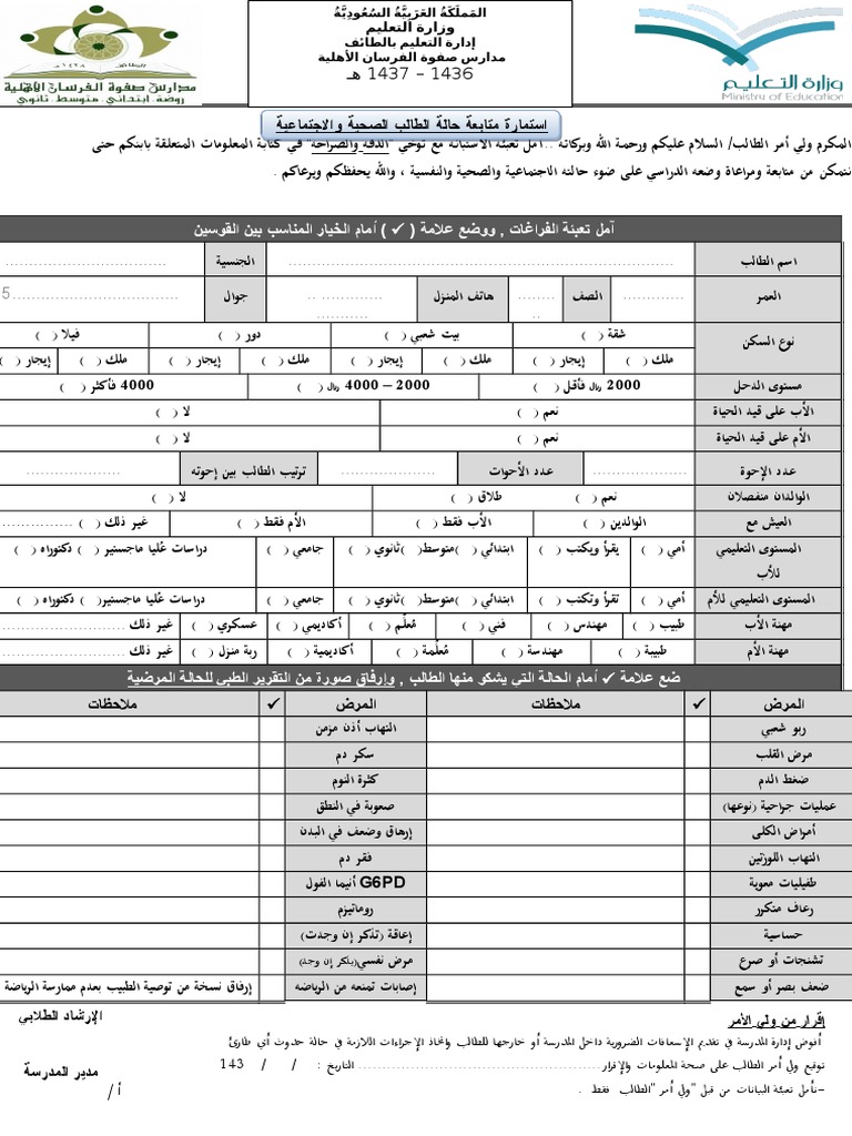 إستمارة حصر الأمراض للطلاب doc 73 0 كيلوبايت المشاهدات 11983 22تفريغ الحالات الصحية للطلاب لعام 36 doc 58 5 كيلوبايت المشاهدات 15083. استمارة شاملة الحالات الصحية والإجتماعية doc 121 5 كيلوبايت 1648 مشاهدات نموذج حصر الأمراض الصحية والطلاب الأيتام doc 63 0 كيلوبايت 1449 مشاهدات. استمارة حصر الحالات الصحية والاجتماعية ورقة واحدة 1434 1435 منتدى التوجيه و الإرشاد. أستمارة بيان الحالات الصحية و الطلاب الأيتام و خطاب سرية المعلومات للمعلمين 2019 03 09 0 42 أقل من دقيقة.
