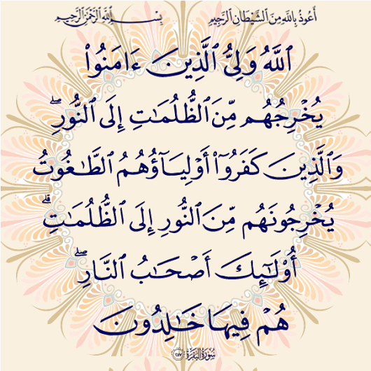 الله ولي الذين آمنوا يخرجهم من الظلمات إلى النور والذين كفروا أولياؤهم الطاغوت يخرجونهم من النور إلى الظلمات أولئك أصحاب النار هم فيها خالدون 257 يخبر تعالى أنه يهدي من اتبع رضوانه سبل السلام فيخرج عباده المؤمنين من.