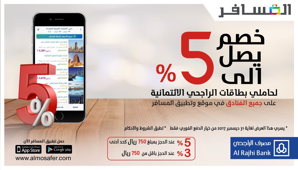 كوبون المسافر لتستفاد بأقل سعر تزكرة موجود بالأسواق وأقل سعر غرفة ممكن ان تحصل عليها. كود خصم المسافر almosafer تخفيض 10 على حجوزات الطيران بإستخدام بطافات بنك الراجحي الآن يمكنك الإستفادة من التخفيض المتاح من خلال موقع و تطبيق المسافر لعملاء بنك الراجحي في المملكة العربية السعودية على كافة الحجوزات عبر. احصل الآن على خصومات الراجحي من موقع المسافر خصم يزيد عن 100 ريال على كل الحجوزات بفضل كود خصم الراجحي من المسافر كل ما عليك هو امتلاك بطاقات الراجحي الائتمانية لتحصل على الخصومات مباشرة. وفر 5 على رحلات طيران الخليج السعودية.