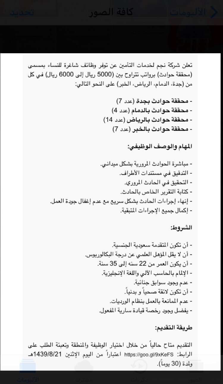 وظائف شركة نجم 1439. سعودي الجنسية. تعلن شركة نجم لخدمات التأمين عن توفر وظائف شاغرة للنساء بمسمى محققة حوادث برواتب تتراوح بين 5000 ريال إلى 6000 ريال في كل من الرياض جدة الدمام. تعلن شركة نجم لخدمات التأمين عن توفر وظيفة شاغرة لحملة البكالوريوس بمسمى نائب رئيس العمليات من أجل العمل بالشركة في مدينة الرياض وذلك حسب التفاصيل الواردة. أعلنت شركة نجم لخدمات التأمين عبر موقعها الإلكتروني بوابة التوظيف توفر وظائف شاغرة للرجال وللنساء بمسمى موظف دعم فني ومحلل أول الأعمال ومطو ر أول تطبيقات ومطو ر أول تطبيقات الجوال ومحلل تطبيقات ومحلل حلول.