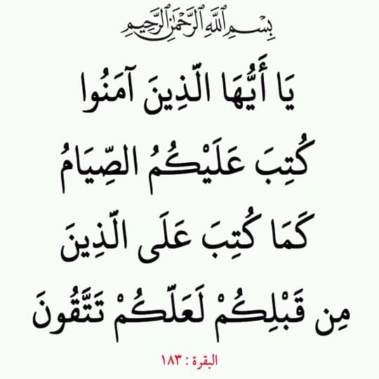 يا أيها الذين آمنوا ك تب عليكم الصيام كما كتب على الذين من قبلكم أما الذين من قبلنا. ي ا أ ي ه ا ال ذ ين آم ن وا ك ت ب ع ل ي ك م الص ي ام ك م ا ك ت ب ع ل ى ال ذ ين م ن ق ب ل ك م ل ع ل ك م ت ت ق ون. يا أيها الذين آمنوا كتب عليكم الصيام كما كتب على الذين من قبلكم لعلكم تتقون أياما معدودات فمن كان منكم مريضا أو على سفر فعدة من أيام أخر وعلى الذين يطيقونه فدية طعام مسكين فمن تطوع خيرا فهو خير له وأن تصوموا خير لكم إن.